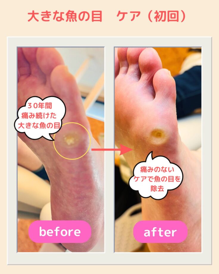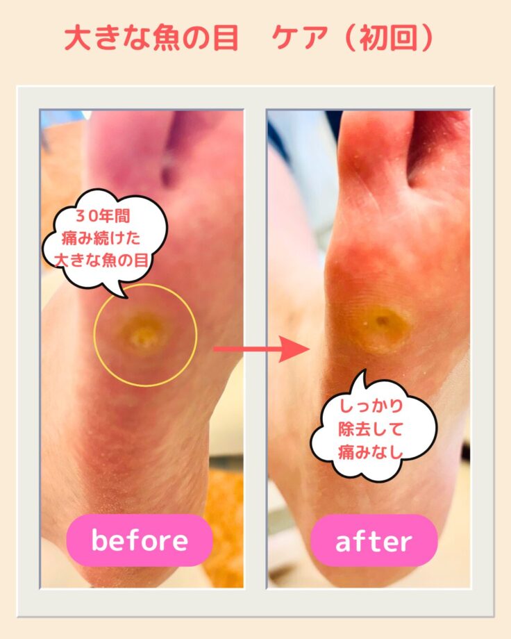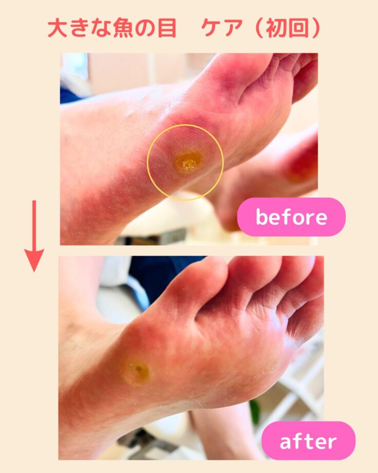 そう思いながら、痛みの原因となる魚の目のケアを丁寧に行いました。
