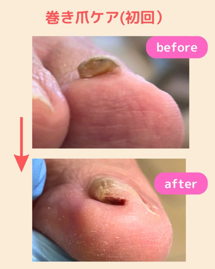 巻き爪は放置すると再発や炎症、歩行への影響にもつながります。定期的にケアを行うことで、爪が正しい方向に伸びていくようサポートできます。