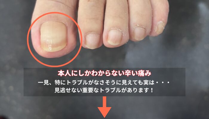 痛みがなくても爪が皮膚に当たると陥入爪を併発し、強い痛みにつながります。