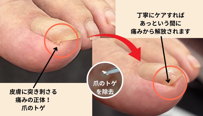 ほんのわずかな爪の棘でも、毎日の歩行では「ホチキスの芯が一歩ごとに突き刺さるような感覚」を生み、想像以上の苦痛になります。