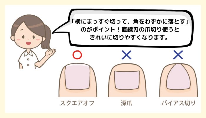 - 深爪は避け、四角い形(スクエアオフ)に整える