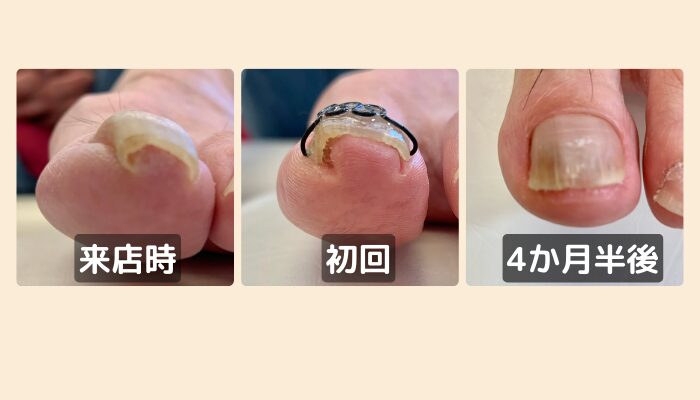 カウンセリングで爪の端を確認すると、皮膚に尖った爪が刺さり込んでいる状態でした。それを丁寧に取り除くと、