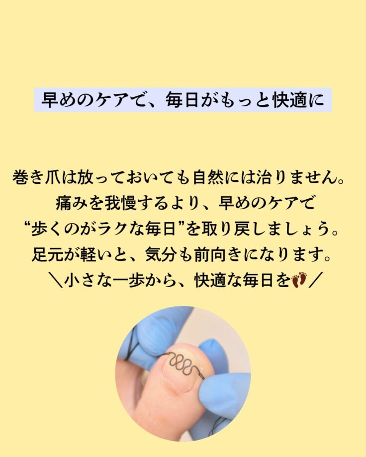 見た目が広がったように見えても、爪の根元は巻いたままのことがあるため、継続ケアがとても重要です。