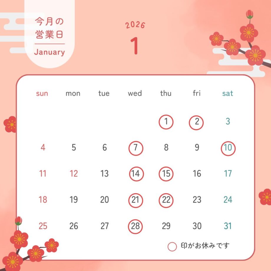当サロンの2026年1月の営業日は、下記の通りとなります。
